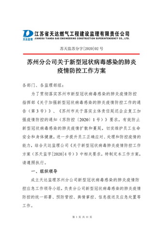 會議傳達、學習了中央、省、市和天達控股公司、監理公司疫情防控工作部署和精神,對蘇州分公司當前開展的疫情防控工作進行分析和總結,對下一階段工作進行部署。目前,江蘇省已啟動突發公共衛生事件一級響應,蘇州分公司各職能部門、各監理部組要按照疫情防控工作要求,切實落實《蘇州分公司關于新型冠狀病毒感染的肺炎疫情防控工作方案(蘇天監蘇分字[2020]02號)》,每日按時填報《監理部組人員每日健康情況登記表》;嚴格按照蘇州市有關復工時間要求做好復工前的準備工作,并在復工前填報《監理部組復工時間及相關信息登記表》;復工后做好辦公場所消毒工作和監理人員自身的疫情防護,對來訪人員做好信息登記等,切實做好疫情防控工作。